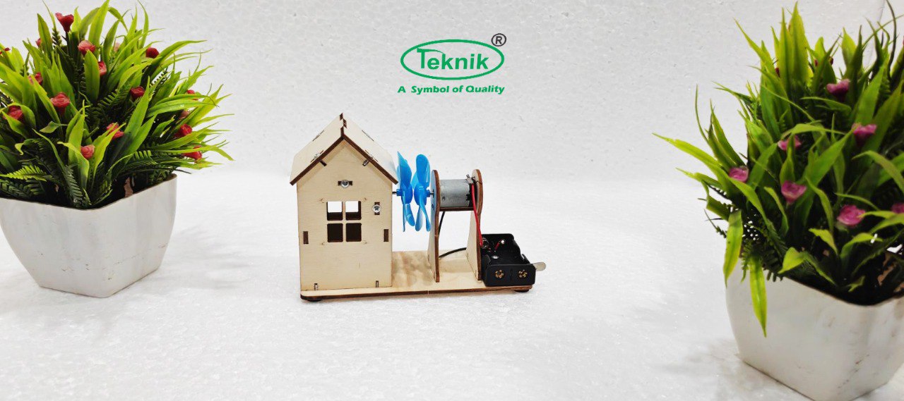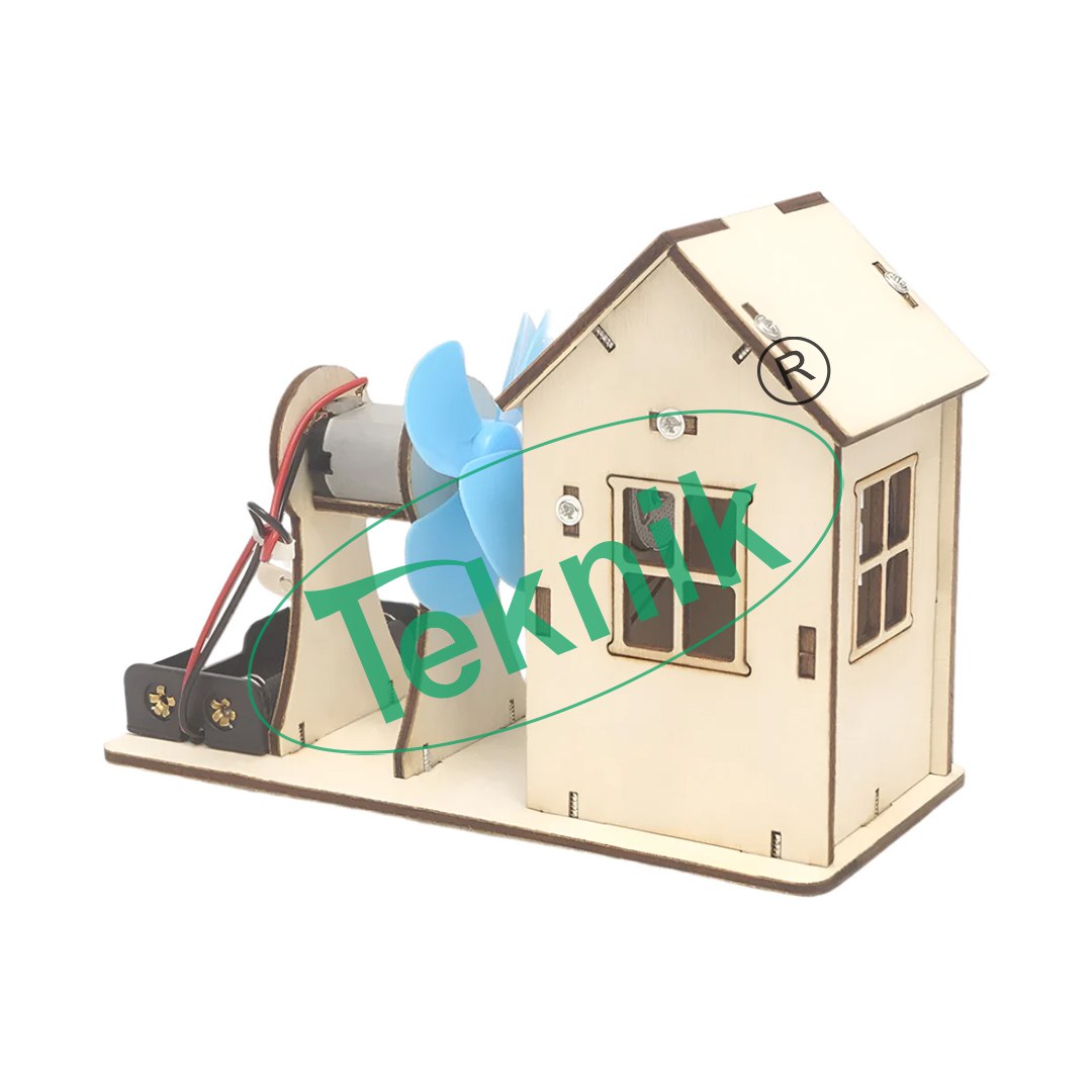 DIY Wind Power Station Science Toy Kit is an educational hand–on model designed to introduce students to the concept of wind energy and electricity generation using a small wind turbine system. The kit includes a wooden house structure, rotating multi–blade fan, mini DC motor and battery compartment. When the fan blades rotate (by blowing air / fan / hand), the motor converts rotational mechanical force into electrical energy demonstrating basic wind power generation principle similar to real windmills and wind power plants.