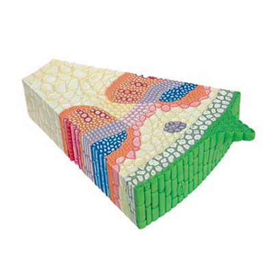 This model, enlarged 500X life size, shows the cross and longitudinal section of a monocot leaf. Significant structures include dorsal and ventral page, xylem, phloem and mesophyll with mounted on board.