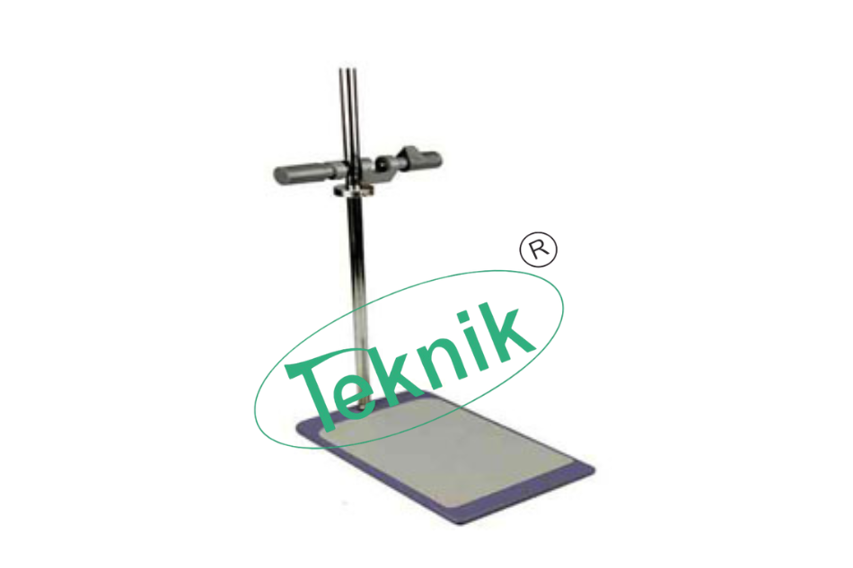 Universal stand with clips to hold burette, test tube either in vertical or horizontal manner. A rubber mat is provided on the base to place the beakers, flask etc.